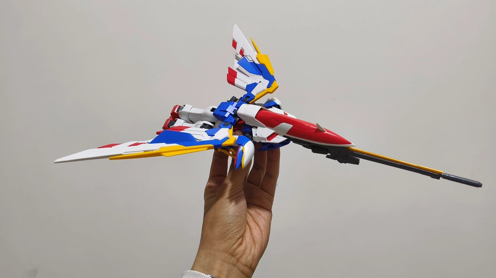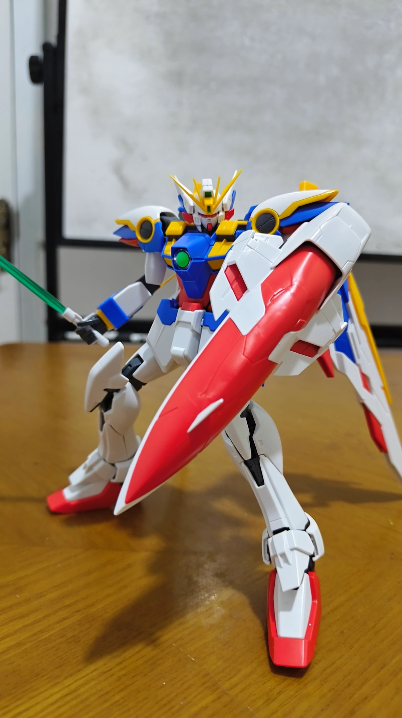 另外一个是MG飞翼高达,其实我对这个高达并不感兴趣,只是为了看看它的一趴变形结构。素组了一下,脸部勾了线,其它的水贴都懒得贴。最终变形结构也挺失望,看说明书也没看懂那个盾牌到底怎么固定的。话说那把枪也实在太长了吧!