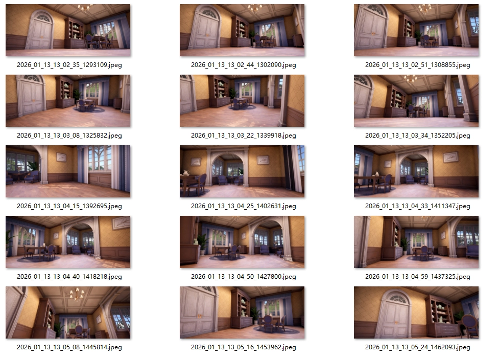 我这里使用了《无限暖暖》这个3D游戏,因为它的截图比较方便,能完全隐藏UI和人物。在一间屋子里,以大概每20度拍摄一张照片,覆盖屋内的所有家具。