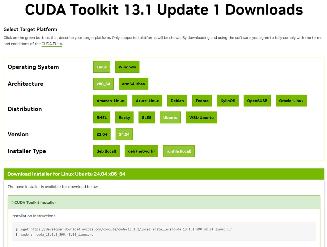 按照页面提示,获取到用于Ubuntu 24版本的CUDA Toolkit下载路径,当前版本是13.1。